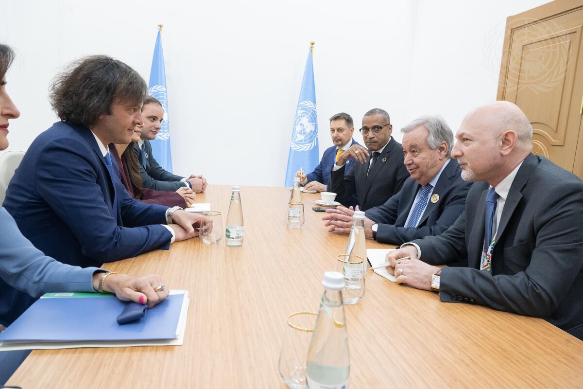 UN Secretary-General António Guterres (center right) meets Irakli Kobakhidze (left), Prime Minister of Georgia during the Third United Nations Conference on Landlocked Developing Countries, held in Awaza, Turkmenistan. On the left and right of the Secretary-General are Courtenay Rattray, Chef de Cabinet of the Secretary-General and Kaha Imnadze, Special Representative of the Secretary-General for Central Asia.