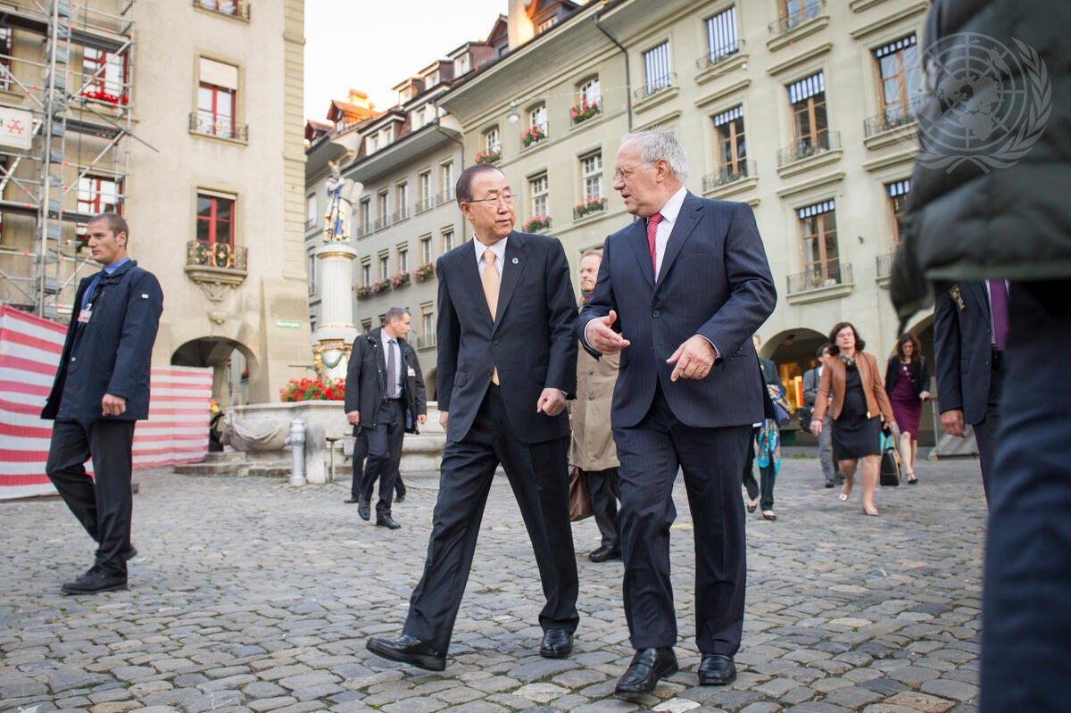 Secretary-General Ban Ki-moon (left) tours Bern's historic centre on foot, accompanied by Johann N. Schneider-Ammann, President of the Swiss Confederation.