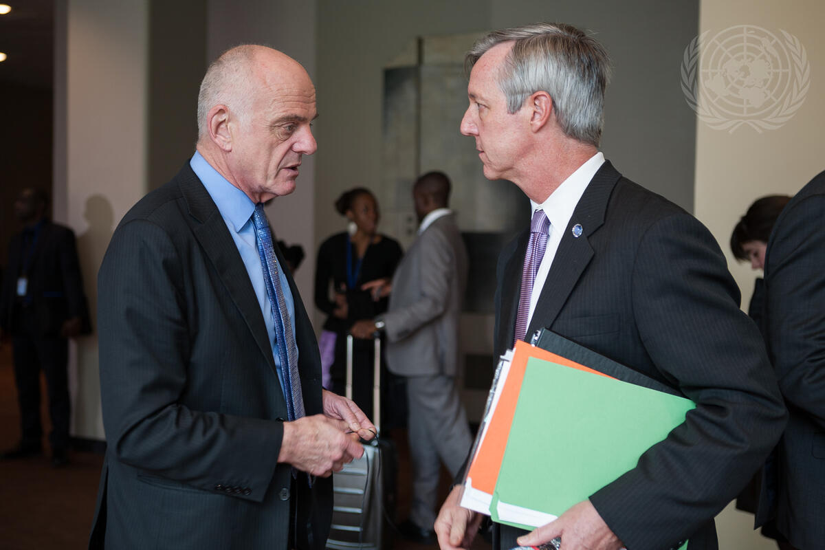 Anthony Banbury (right), Special Representative of the Secretary-General and Head of the UN Mission for Ebola Emergency Response (UNMEER), confers with David Nabarro, Special Envoy of the Secretary-General on Ebola, after speaking to journalists following his briefing to the General Assembly on the public health crisis emanating from the Ebola virus outbreak in West Africa.