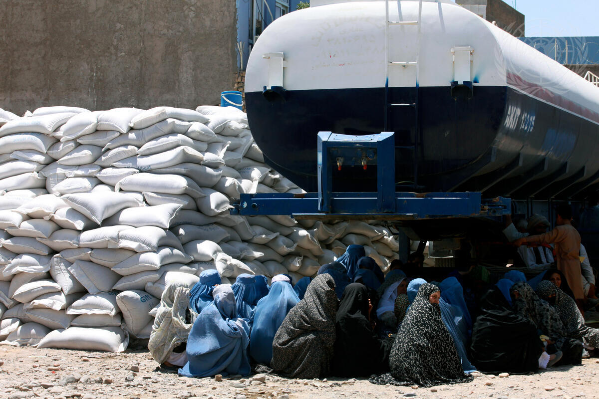 In Herat, Afghanistan, women find relief from the 45 degree mid-day sun at a World Food Programme (WFP) food distribution point.