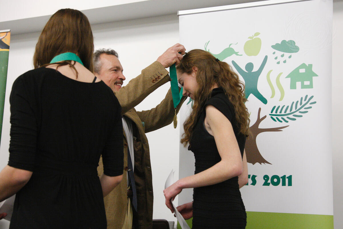 Steven Johnson (ITTO) presents Forest Heroes Awards to the North American winners, Rhiannon Tomtishen (right) and Madison Vorva, young activitsts from the United States.