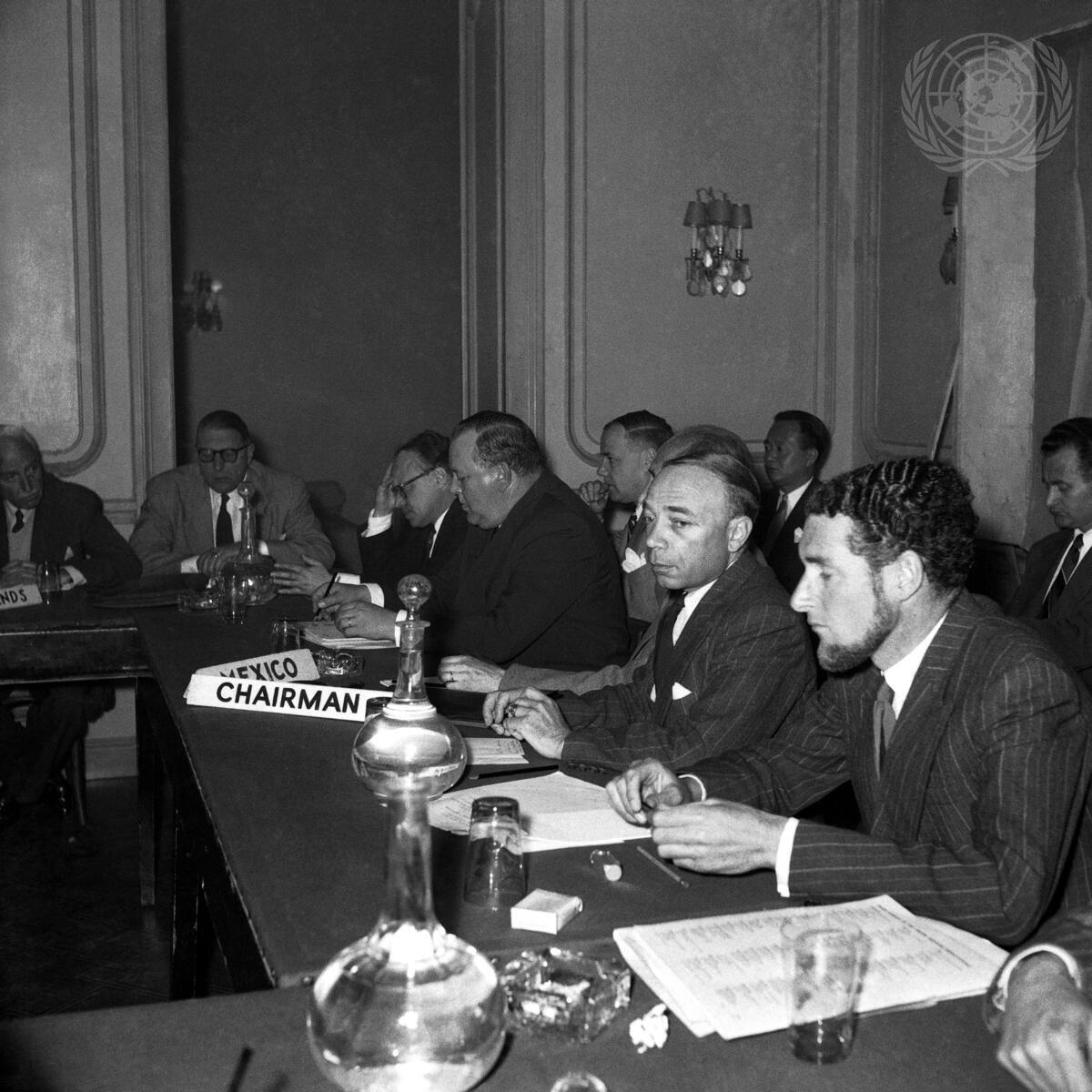 While in Athens, during his recent trip to Europe and the Middle-East, Mr. Trygve Lie (reading a document), U.N. Secretary-General, attends a closed session of the United Nations Special Committee on the Balkans (UNSCOB). On Mr. Lie's right is Mr. A.H. Feller, Principal Director of the U.N. Legal Department.