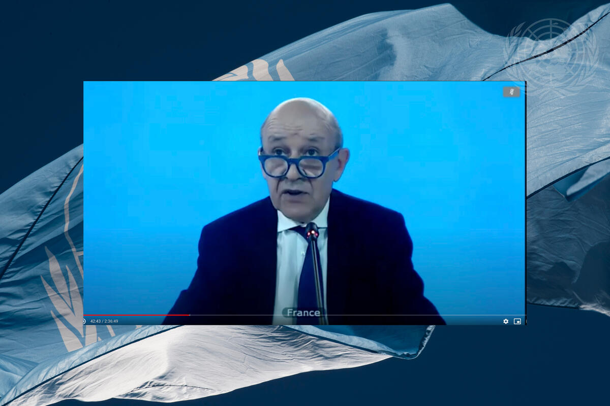 Jean-Yves Le Drian, Minister for Europe and Foreign Affairs of the Republic of France, addresses the Security Council members during an open videoconference in connection with ""Maintenance of International Peace and Security: Implications of COVID-19"".