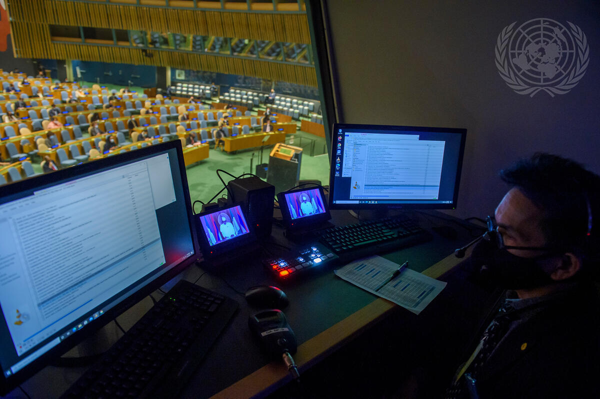 Staff of the United Nations Broadcast and Conference Support Section (BCSS) at work with the pre-recorded videos with speeches of Heads of States, Governments and Ministers during the first day of the general debate of the General Assembly's seventy-fifth session.
