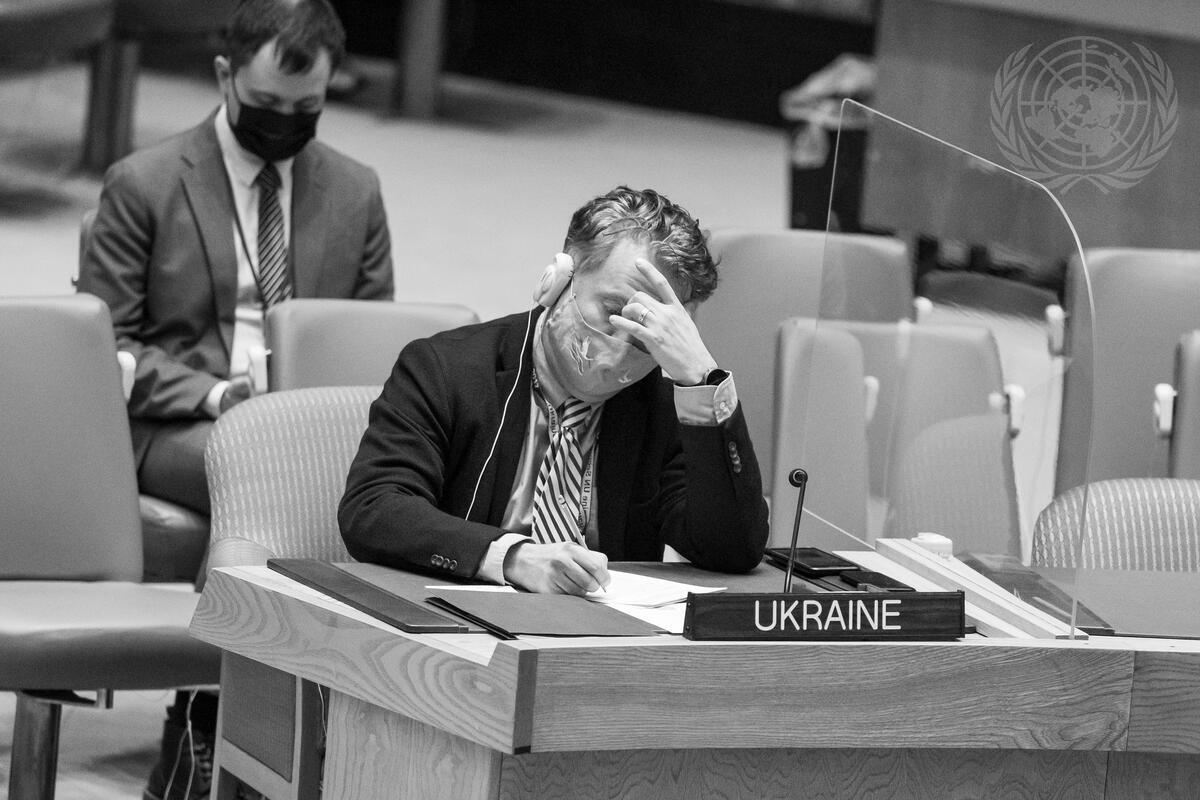Sergiy Kyslytsya, Permanent Representative of Ukraine to the United Nations, takes notes during the Security Council meeting on the situation in Ukraine.