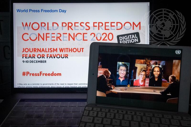 Antonio Zappulla (on screens and in the centre at dais), CEO of the Thomson Reuters Foundation, moderates the panel discussion during the commemoration of the 30th Anniversary of World Press Freedom Day on the theme "Shaping a Future of Rights: Freedom of expression as a driver for all other human rights". Seated from left to right are: Esmeralda Arosemena de Troitiño, First Vice-President of the Inter-American Commission on Human Right; Hassatou Ba-Minte, Africa Programme Director at the International Federation for Human Rights (FIDH); Mr. Zappulla; Dunja Mijatovic, Human Rights Commissioner of the Council of Europe; and Ilze Brands Kehris, UN Assistant Secretary-General for Human Rights.