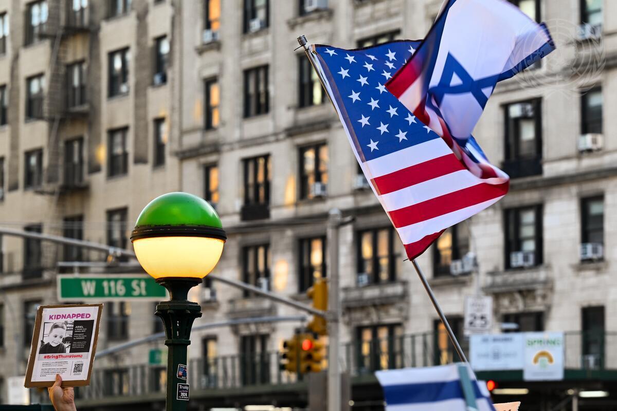 A view of protesters demonstrating outside the campus of Columbia University in New York City. The protests are in regard to the situation in Israel, Gaza, and Palestine.